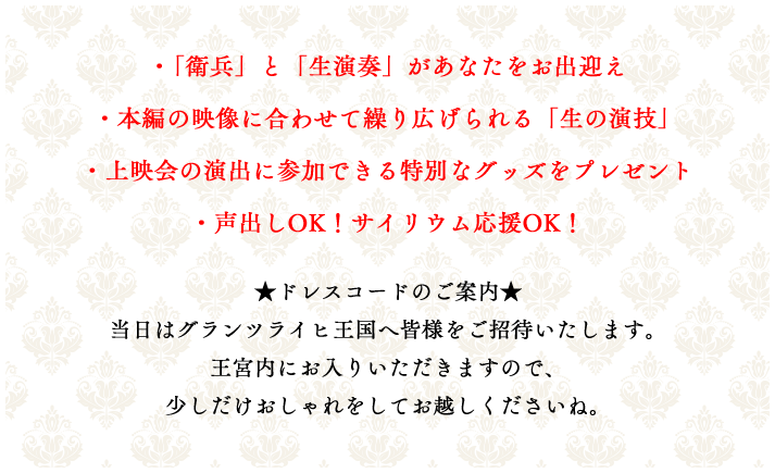 ・火器類の持ち込み・クラッカー・笛などの鳴り物の使用、飛ぶ・跳ねる・暴れる・物を叩くなどの周りの方のご迷惑になる行為は固くお断りいたします。余りに過剰に行われた場合は上映中止になる場合もございます。